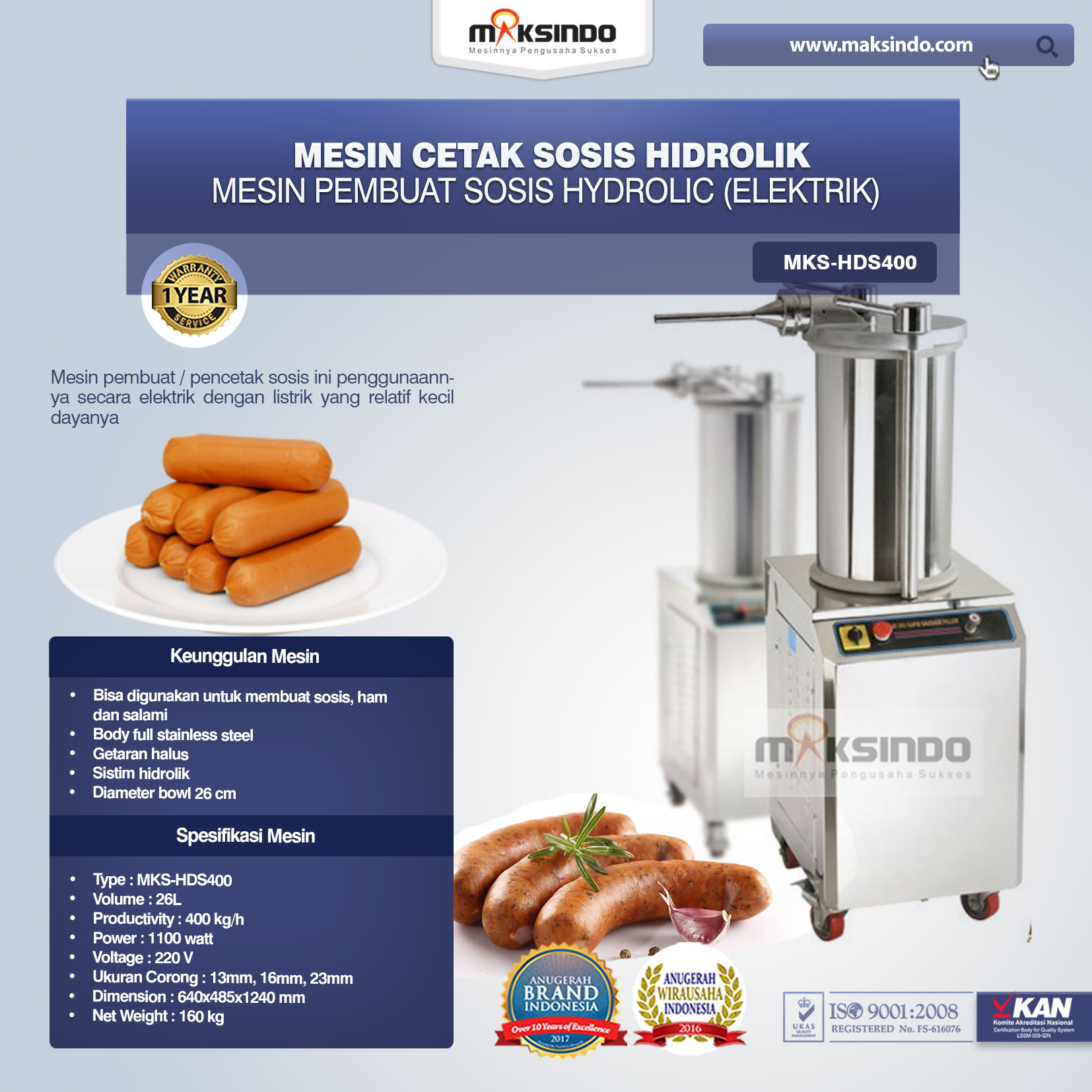 Jual Mesin Cetak Sosis Hidrolik MKS-HDS400 di Medan