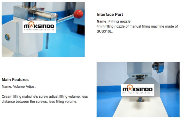 Fungsi mesin manual filling ini adalah mengisi (filling) produk berupa cairan (liquid) dan cream (pasta) ke dalam kemasan, dalam ukuran yang konstant sesuai dengan pengaturan