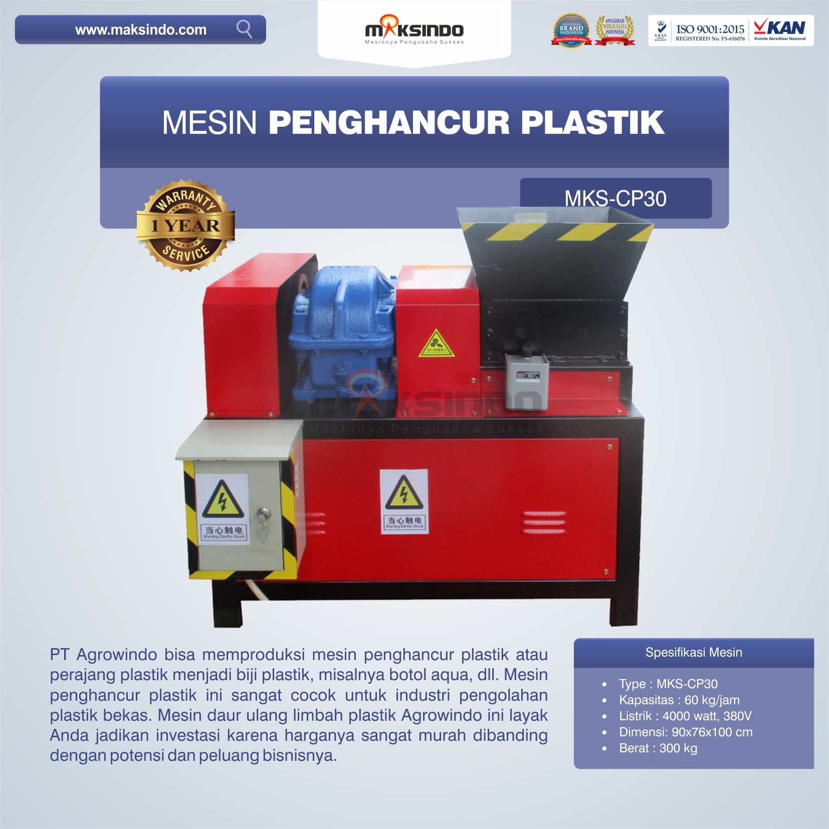 Jual Mesin Penghancur Plastik MKS-CP30 di Medan