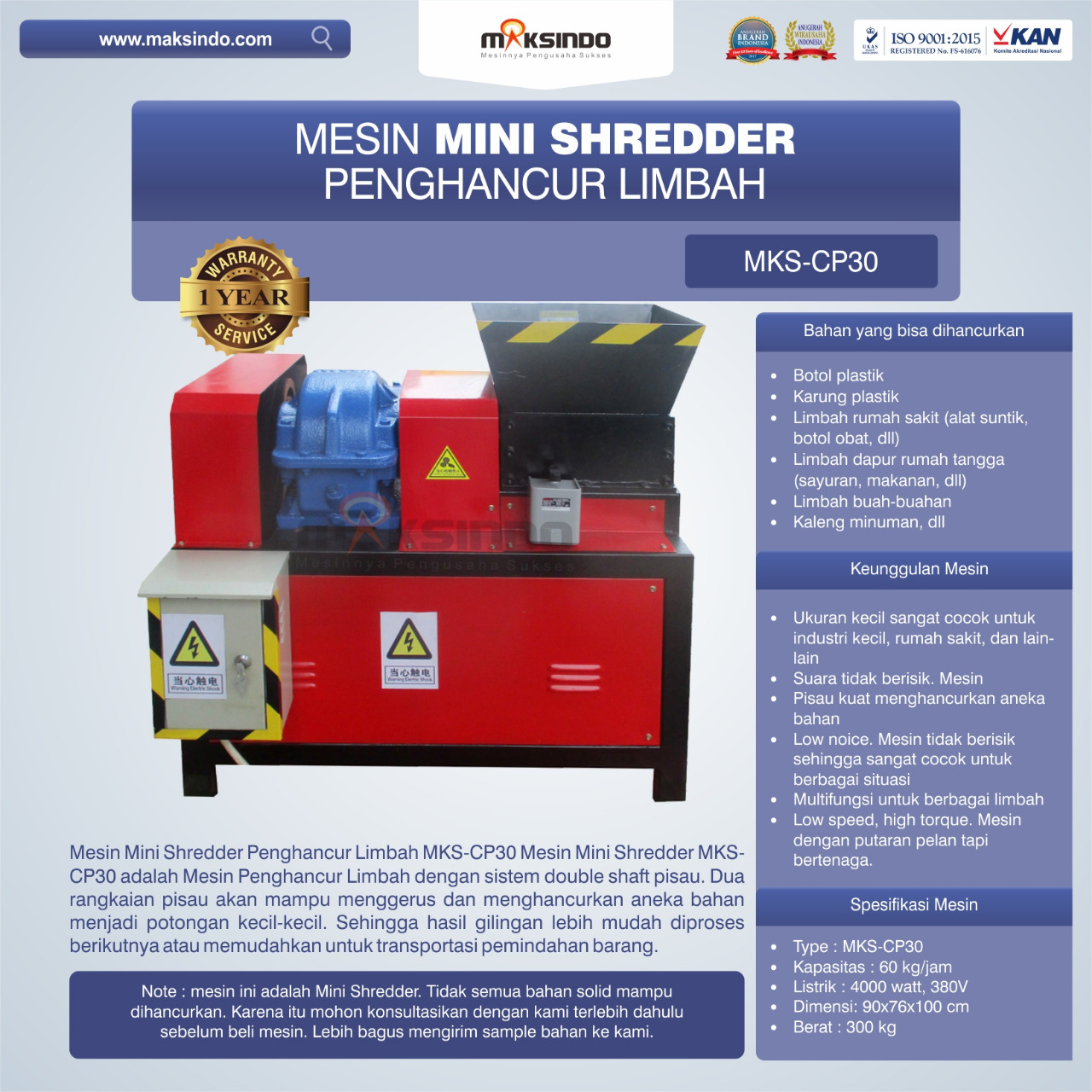 Mesin Mini shredder MKS-CP30 adalah mesin penghancur limbah dengan sistem double shaft pisau. Dua rangkaian pisau akan mampu menggerus dan menghancurkan aneka bahan menjadi potongan kecil-kecil. Sehingga hasil gilingan lebih mudah diproses berikutnya atau memudahkan untuk transportasi pemindahan barang.