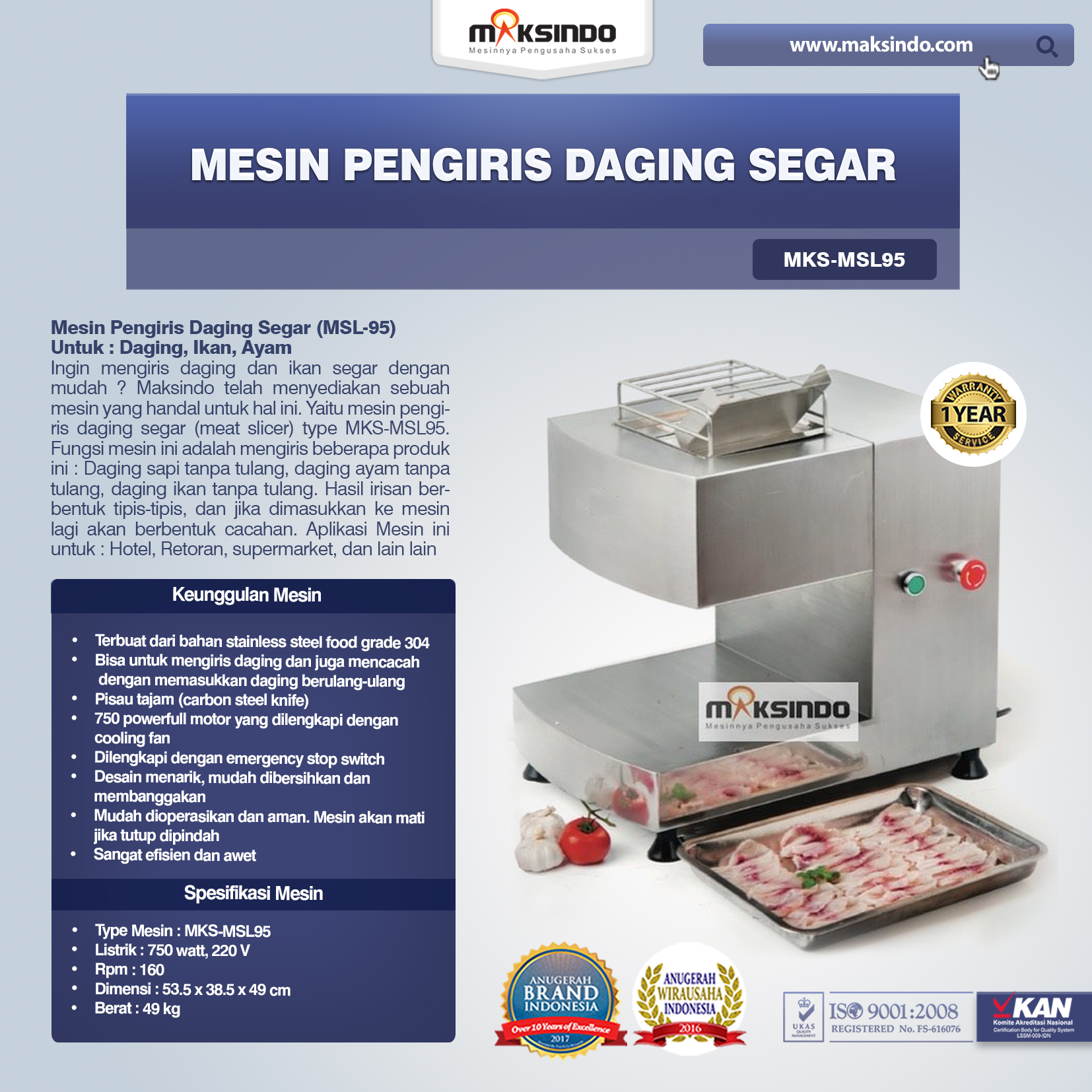 Ingin mengiris daging dan ikan segar dengan mudah ? Maksindo telah menyediakan sebuah mesin yang handal untuk hal ini. Yaitu mesin pengiris daging segar (meat slicer) type MKS-MSL95.