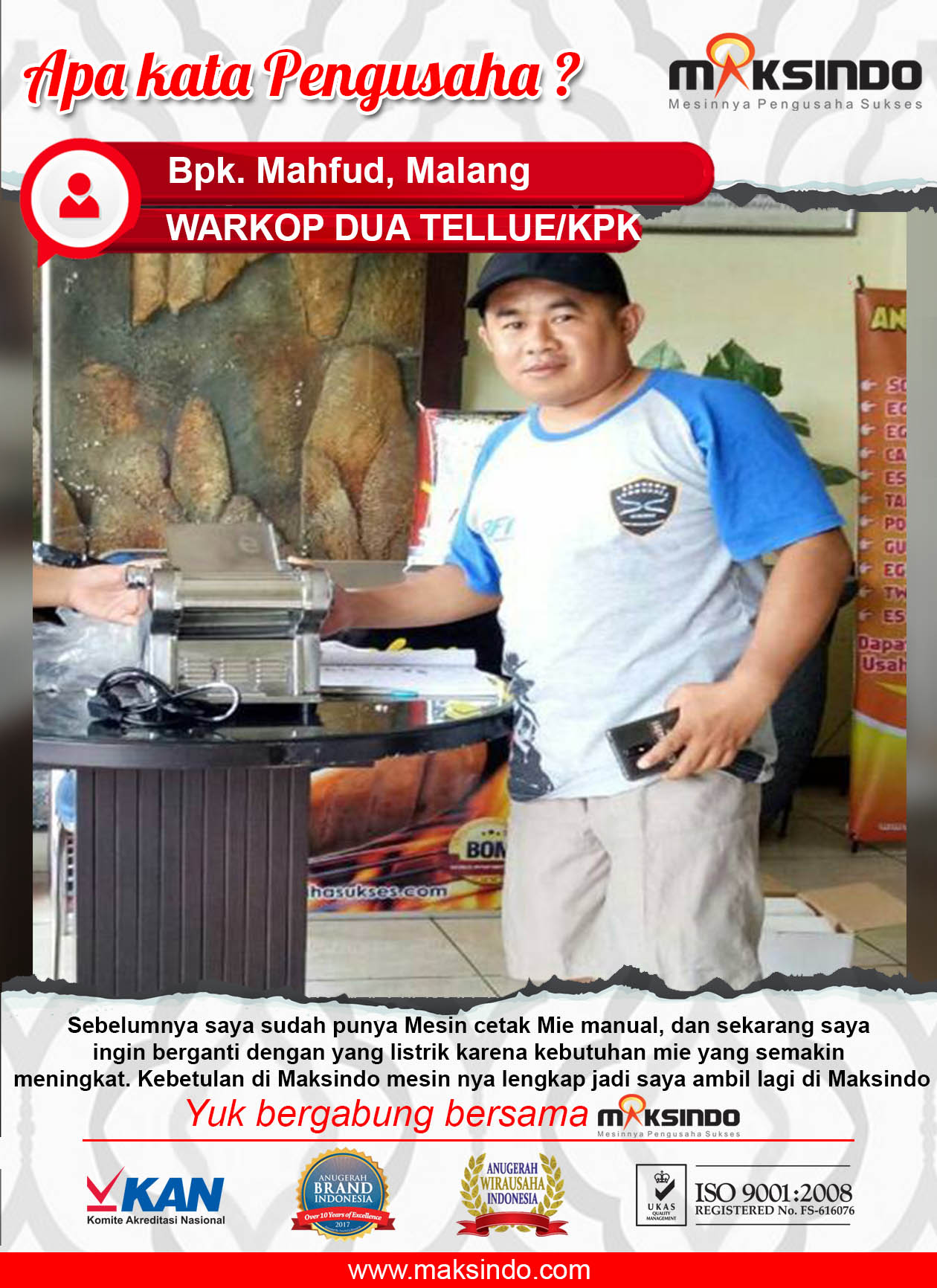 Terima kasih kepada Bapak Mahfud yang sudah menggunakan mesin cetak mie dari Maksindo. Semoga usaha “Warkop Dua Tellue/KPK” ini dapat berjalan lebih maju lagi.