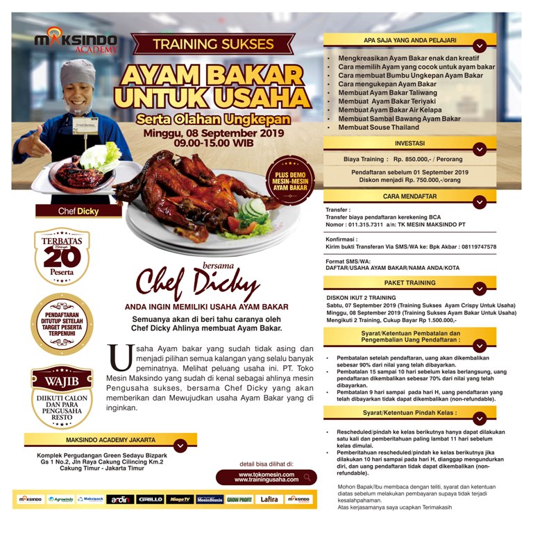 Anda ingin memiliki usaha ayam bakar Semuanya akan di beri tahu caranya oleh Chef Dicky Ahlinya membuat Ayam Bakar. Usaha Ayam bakar yang sudah tidak asing dan menjadi pilihan semua kalangan yang selalu banyak peminatnya. Melihat peluang usaha ini Toko Mesin Maksindo yang sudah di kenal sebagai ahlinya mesin pengusaha sukses, bersama bapak Chef Dicky yang akan memberikan dan Mewujudkan usaha Ayam Bakar yang di inginkan.